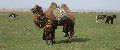 Der mongolische Sattel Der traditionelle mongolische Sattel ist durch seine Holzbasis ziemlich kurz und hoch. Vorder- und Hinterzwiesel sind recht weit hochgezogen. Dadurch wird der Sitz des Reiters stabilisiert und er ist davor geschützt, nach vorne und nach hinten zu fallen (das wird als sehr gefährlich angesehen). Der Sitz wird häufig mit kleinen, reich verzierten Metallstücken geschmückt, die den Reiter aber natürlich nicht verletzen, der durch die vielfachen Schichten seiner traditionellen Reitkleidung geschützt ist. Die Steigbügel werden immer sehr kurz gehalten und sie haben häufig einen ziemlich schmalen Durchstieg, sodass der Fuß bei einem Sturz nicht so leicht hindurchrutscht. Die kleine Größe des Sitzes ist dem kurzen Rücken der mongolischen Pferde perfekt angepasst. Westernsättel oder englische Sättel sind auch in der kleinsten Größe noch zu groß, sie würden den Rücken des Pferdes verletzen. Außerdem ist dieser sehr hohe Sitz der traditionellen mongolischen Reitweise angepasst, die größtenteils darauf basiert, das Pferd im ruhigen Sitz zu lenken und zu stoppen. Tatsächlich kann man es sich leicht vorstellen, dass der Reiter beim Reiten ohne Sattel mit seinem Gewicht den Rücken des kleinen mongolischen Pferdes nahezu zerquetscht, das dann viel von seiner Beweglichkeit verliert. Bilder aus dem achten Jahrhundert und auch spätere Darstellungen aus dem 13. Jahrhundert zur Zeit des Dschingis Khan zeigen bereits Reiter, die im Vergleich mit europäischen und arabischen Reitern sehr hoch über ihrem Pferd sitzen, damals noch mit sehr langen Steigbügeln. Dieser Sattel ermöglicht eine sehr leichte Reitweise, die den Pferderücken entlastet und sein natürliches Gleichgewicht und Lebenskraft wieder herstellt. Und damit ist es während der großen Mongolenstürme bis nach Europa gekommen! Mongolisches Zaumzeug Das traditionelle nomadische Zaumzeug in der Mongolei ist ebenso ursprünglich wie der Sattel! Das Gebiss (amgai) besteht aus zwei sehr lange und dünnen Stäben, die viel breiter sind als das Pferdemaul. Bei den europäischen Gebissen sind wir es gewohnt, die Ringe am Maulwinkel des Pferdes zu sehen. Aber in der Mongolei sind sie in der Mitte der Backen. Ausländische Reiter, die die Ringe so weit oben sehen, denken oft, dass sich das Gebiss verdreht hat! Ein mongolischer Reiter verwendet hauptsächlich Halszügel, deren Wirkung durch den Druck der Ringe auf den Backen verstärkt wird. Beim Reiten hält er beide Zügel in seiner rechten und einen Führstrick in der linken Hand, sodass er sein Pferd im Falle eines Sturzes festhalten kann. Maßgeblich ist in der Entwicklung des mongolischen Sattelzeugs immer die Sorge um die Sicherheit, was sich durch die lange Zeit erklärt, die man dort im Sattel verbringt. Hier, wo man als Mensch zu Fuß doch recht verwundbar ist (besonders im Winter bei Temperaturen von-30 °Celsius), ist das Pferd ist für seinen Reiter überlebenswichtig. Das mongolische Pferd Das mongolische Pferd aus Jahrtausend langer unbarmherziger natürlicher Selektion entstanden. Besonders das harte Klima der Steppe hat es geformt und geprägt. Sehr früh hat auch der Mensch schon angefangen, durch seine Auswahl die „Zucht“ der Rasse mitzubestimmen. Obwohl es klein ist, fast ein Pony, sind seine Zähigkeit und Stärke legendär. Es begleitet die Nomaden der Mongolei in ihren täglichen Leben. Es ist ihr Transportmittel und versorgt sie mit Milch und manchmal im Winter mit Fleisch. Geschichte der Rasse Das mongolische Pferd ist eine sehr alte Rasse. Das kann man an vielen Zeichen erkennen: häufige Aalstriche, Zebrastreifen auf den Beinen … Selten hat eine Pferderasse solch eine historische Rolle gespielt. Immerhin kam es auch durch die außergewöhnliche Kraft des mongolischen Pferdes dazu, dass Dschingis Khan im 13. Jahrhundert ein Reich von China bis hinein ins Herz Europas einnehmen konnte! So ist es keine Überraschung, dass wir einige Gene des mongolischen Pferdes in vielen Pferderassen finden können, die entlang des Weges leben, den die Eroberer damals genommen haben! In jüngerer Zeit hat es Versuche gegeben, die mongolischen Pferde mit arabischen Pferden zu kreuzen. Das Ziel war, ihnen etwas mehr Höhe anzuzüchten und gleichzeitig ihre Ausdauer aufrechtzuerhalten. Diese Pferde haben sich wirklich als größer und schneller erwiesen. Das ging soweit, dass sie während der Rennen von Naadam von den traditionellen mongolischen Pferden getrennt werden mussten. Hoffentlich werden diese Initiativen nicht zum Verlust des Originals führen! Morphologie und Charakter des mongolischen Pferdes Das mongolische Pferd klein und hat eine besonders ausgeprägte Vorderhand mit einem kurzen und massiven Hals. Der Körper ist breit, Rücken und Beine sind mit kurz mit starken Gelenken. Im Verhältnis zu seiner Größe ist das mongolische Pferd sehr stark und sehr zäh. Die Pferde sind fast nie beschlagen, außer im Winter im Gebiet von See Khuvsgul, um die Pferde, die die Schlitten auf dem eingefrorenen See ziehen, mit Spikes auszurüsten. Fast alle Farben sind möglich einschließlich solchen mit sehr alten Zeichen wie Zebrastreifen. Mongolische Nomaden haben keinen Namen für ihre Pferde, sie benennen sie anhand ihrer Farbe. Es gibt Dutzende Begriffe, um die feinen Unterschiede der möglichen Farben ihrer Pferde zu beschreiben. Das mongolische Pferd hat einen sanftmütigen Charakter. Obwohl es Monate in der Freiheit der Steppe verbringt, legt es ein sehr ruhiges Verhalten an den Tag, sobald sein Eigentümer es für einen Ritt fängt. Beachten Sie jedoch immer, dass das mongolische Pferd wegen seiner Haltung in der Steppe immer noch viel wildes Verhalten in sich trägt, besonders einen misstrauischen Charakter (oder nennen wir es besser: eine erhöhte Fluchtbereitschaft). Es wird häufig gesagt, dass es ebenso viele Pferde wie Menschen in der Mongolei gibt. Wahr ist, dass es ungefähr drei Millionen Pferde sind. Bevor Sie in der Mongolei reite