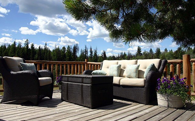Terrassentüren lassen sich auf weiten Sonnendecks öffnen, auf denen Sie sich über Ihre Reitabenteuer bei einem Drink austauschen können während Sie die Vögel in den nahegelegenen Kiefern beobachten.