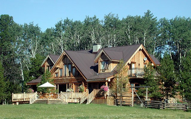 Unsere umweltfreundliche Ranch ist aus handgeschlagenen Fichtenstämmen gebaut und liegt auf einer Kuppe von wo aus man den Siwash See überblicken kann. Das freundliche südliche Klima ist perfekt für die Solarzellen, die verwendet werden um die Ranch mit Strom zu versorgen.
